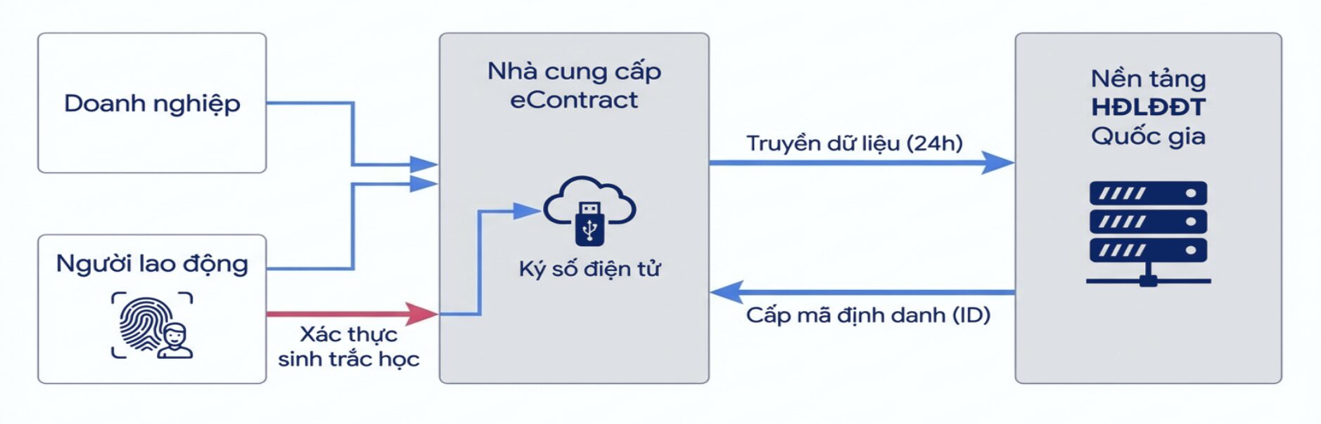 Quy trình từ lúc khởi tạo, xác thực sinh trắc họ, ký số cho đến khi được BNV cấp mã định danh. Lưu ý vai trò trung gian bắt buộc của nhà cung cấp e-Contract.